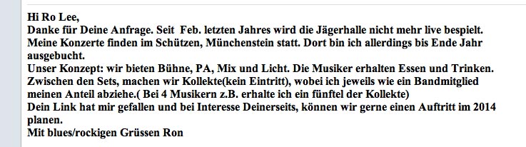 Bezeichnenderweise folgte auf meine Nachfrage, ob das jetzt ernst gemeint oder eine Satire sei und ob er dann für seinen "konzeptionellen" Anteil auch ein- und ausladen helfen komme und ein paar Monatsmieten des Übungsraumes bezahle, keine weitere Reaktion.